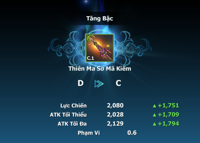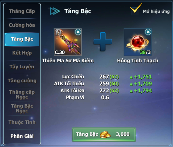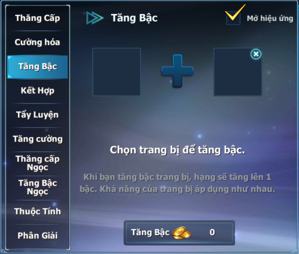 - Hệ thống tăng bậc trang bị là hệ thống giúp tăng bậc thứ hạng trang bị của Hiệp Khách lên cấp cao hơn và đồng thời sức mạnh của trang bị cũng sẽ được tăng cao.