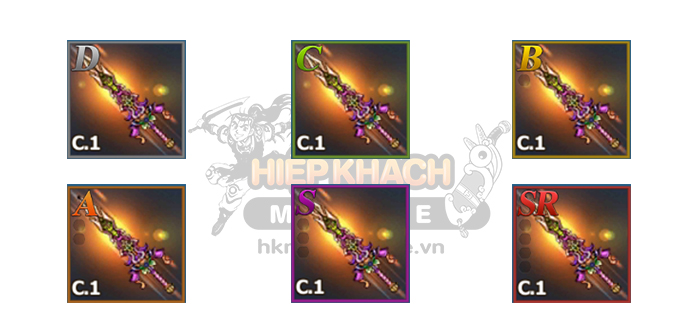 - Đầu tiên, chúng ta hãy tìm hiểu thứ hạng của trang bị, được phân chia từ các bậc: D> C> B> A> S> SR.