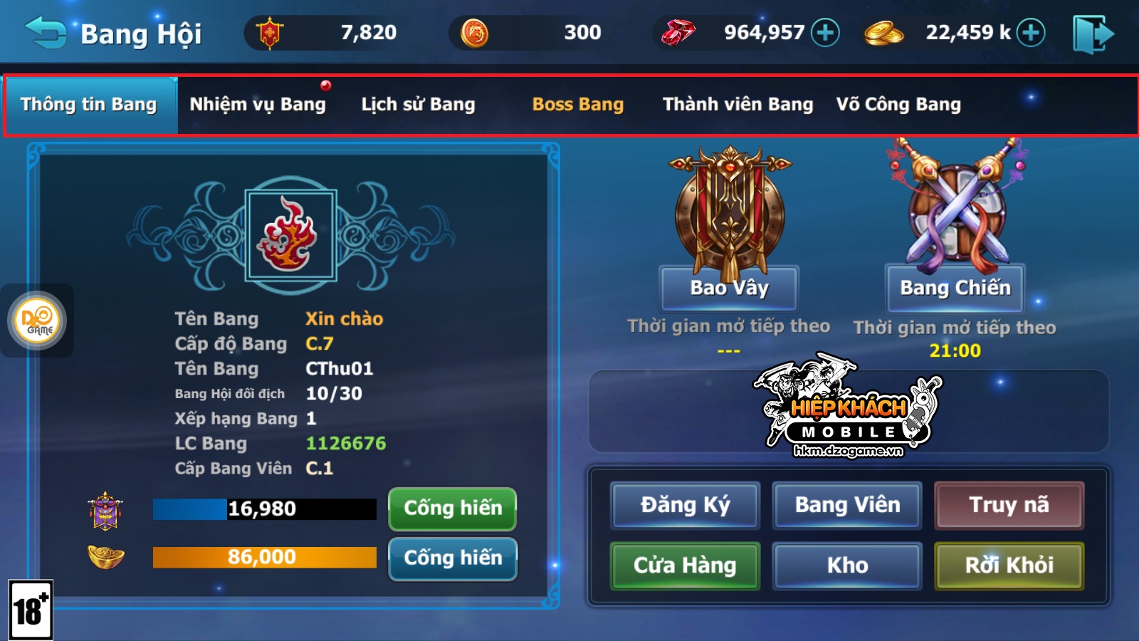 + Thông tin Bang: thông tin, chỉ số hiện tại, Bang Viên, Cửa Hàng, Kho, Truy Nã, Đăng Ký và Rời Khỏi.