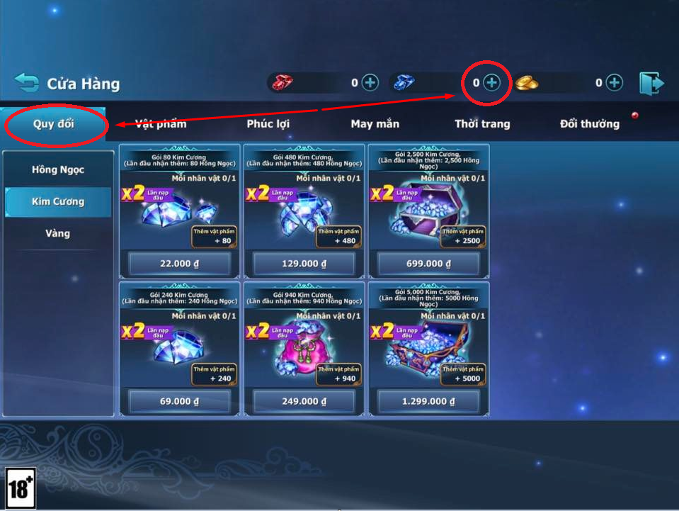 - Bước 2: Bấm vào dấu "+" Kim Cương hoặc chọn mục Quy Đổi sau đó chọn Kim Cương.