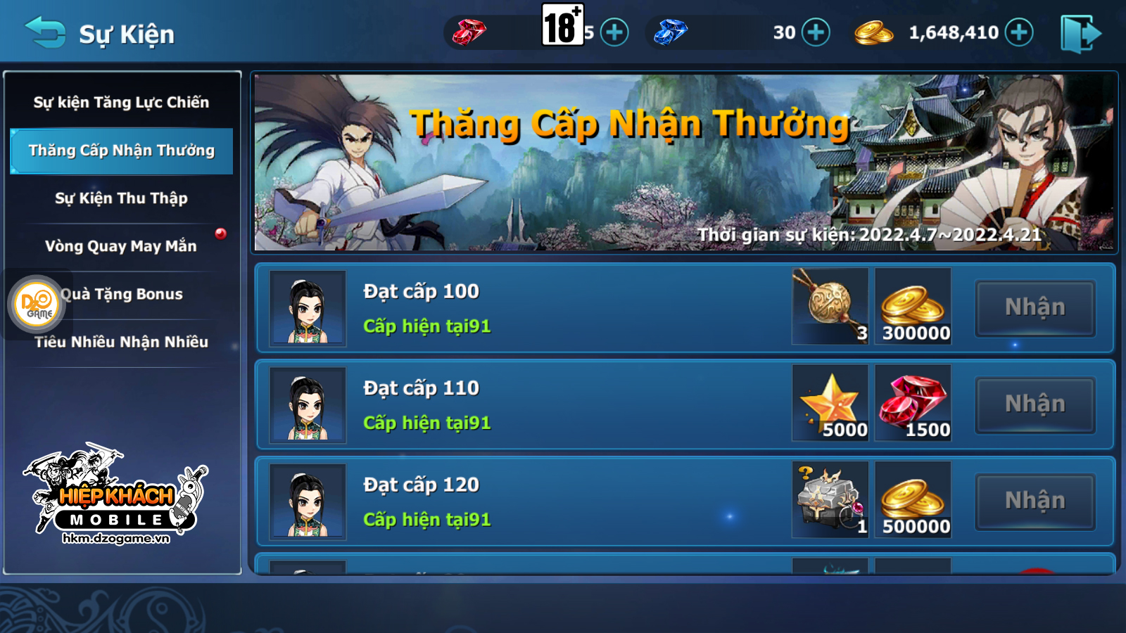 - Khi đạt tới mốc Level theo yêu cầu, Hiệp Khách sẽ nhận được những phần thưởng hấp dẫn.
