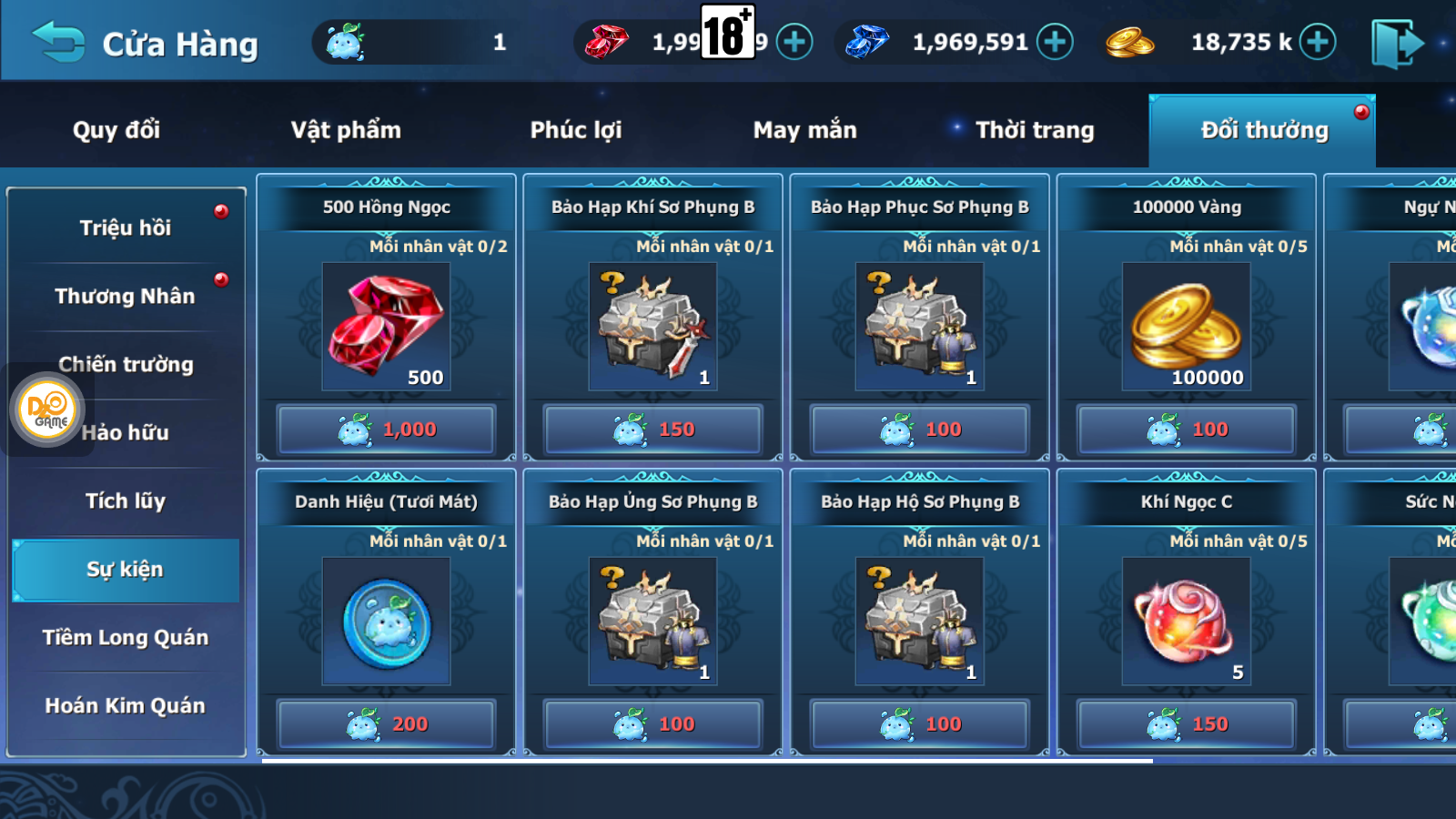 + Hiệp Khách bấm vào biểu tượng Cửa Hàng >> Đổi Thưởng >> Sự Kiện.