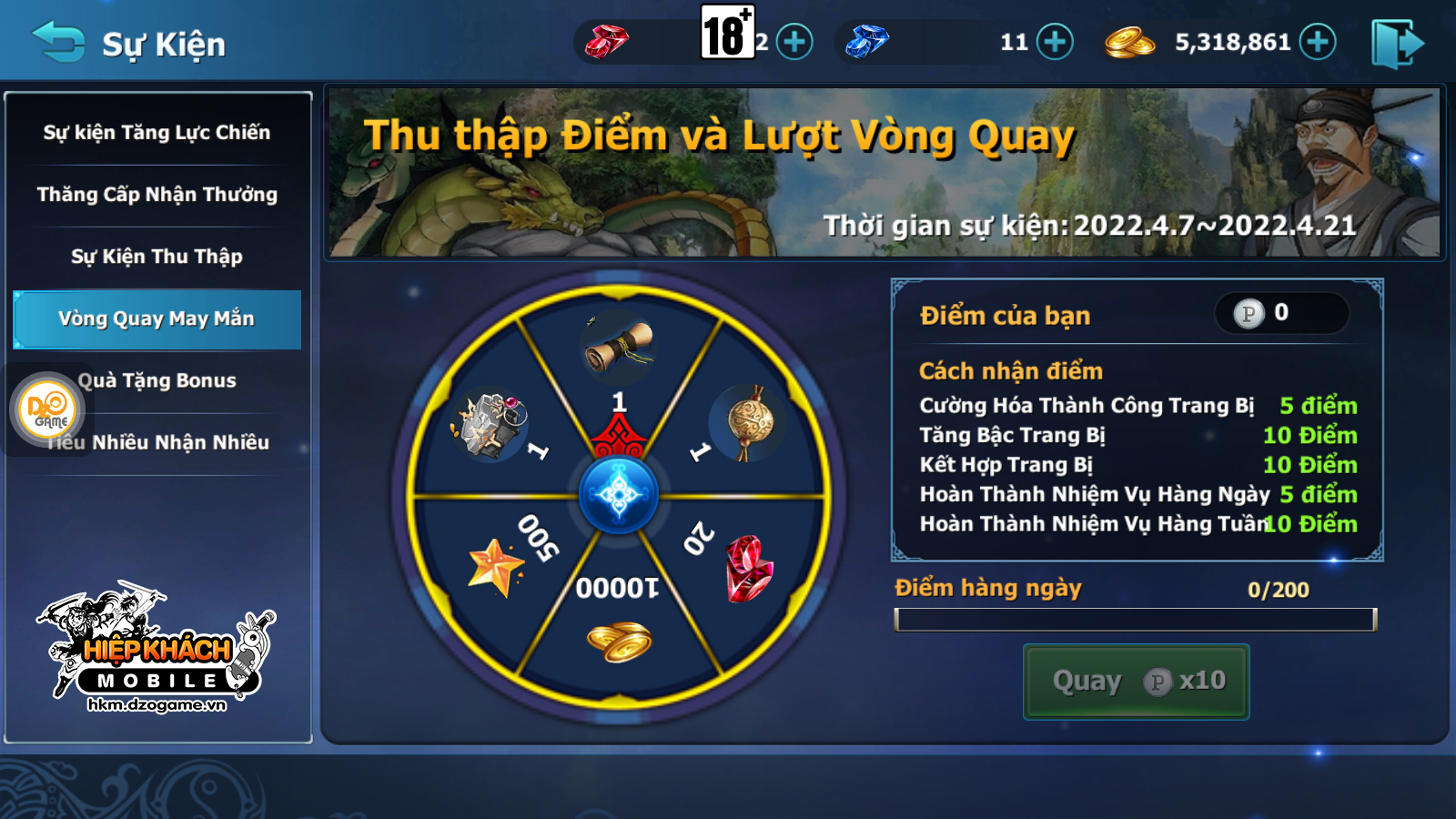 - Trong thời gian diễn ra sự kiện, khi Hiệp Khách hoàn thành đủ các nhiệm vụ yêu cầu sẽ nhận được điểm để quay vòng quay.
