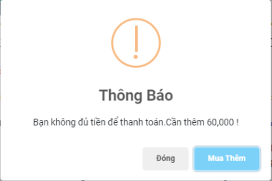 - Trong trường hợp Hiệp Khách không có đủ Dzodong/Dzocoin trong ví thì sẽ hiện thông báo như sau: