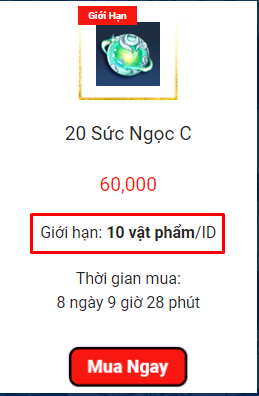 - Tùy theo từng loại vật phẩm và gói vật phẩm sẽ có giới hạn số lần mua trên mỗi Tài Khoản.