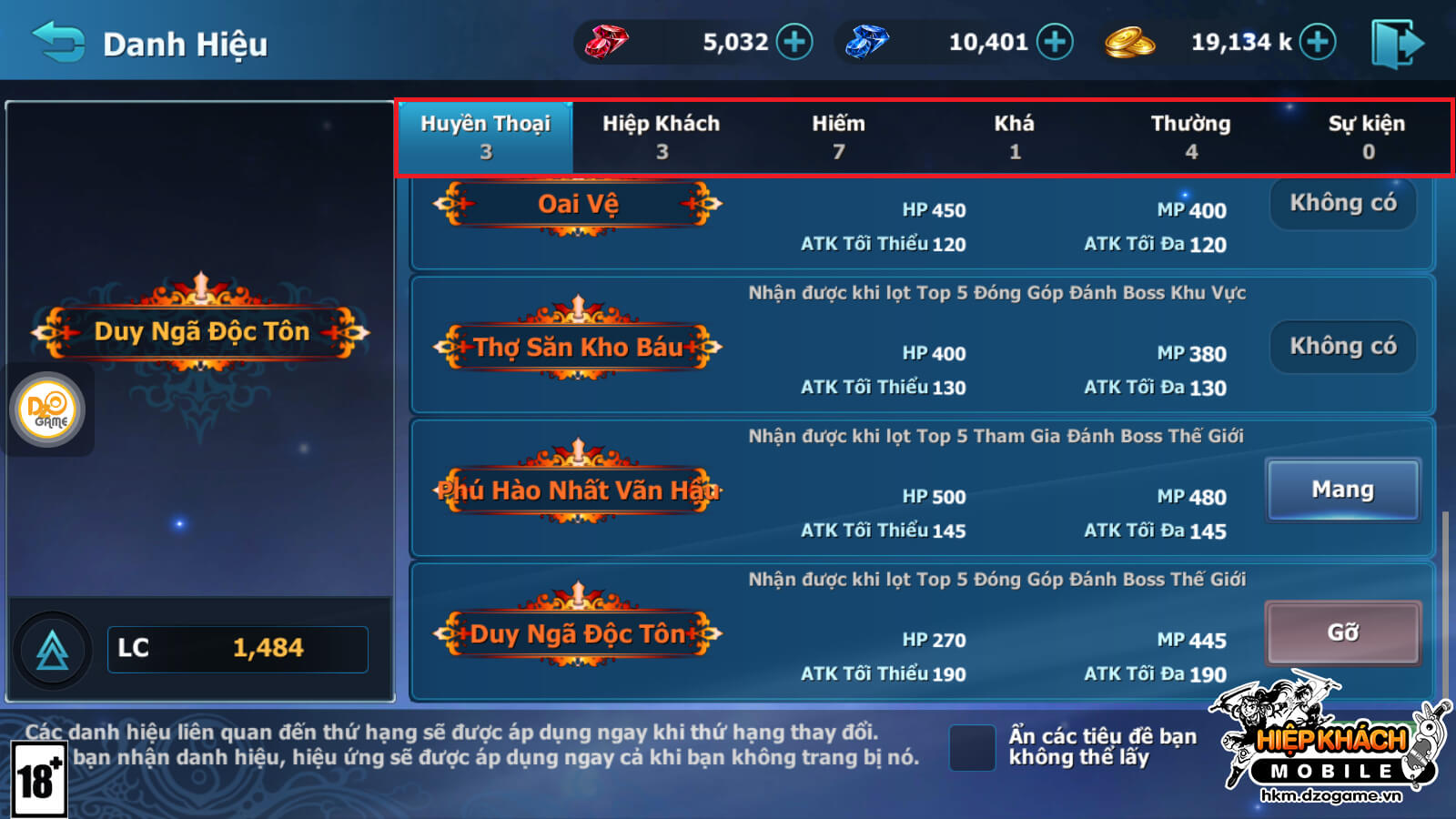 - Có 6 loại Danh Hiệu: Thường, Khá, Hiếm, Hiệp Khách, Huyền Thoại, Sự Kiện.
