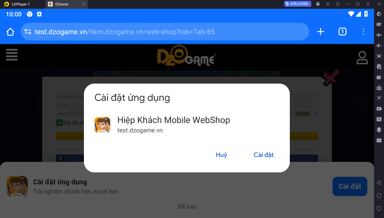 🔹Bước 3: Cửa sổ thông báo cài đặt App Webshop sẽ hiển thị, Hiệp Khách bấm vào cài đặt để cài app về máy.