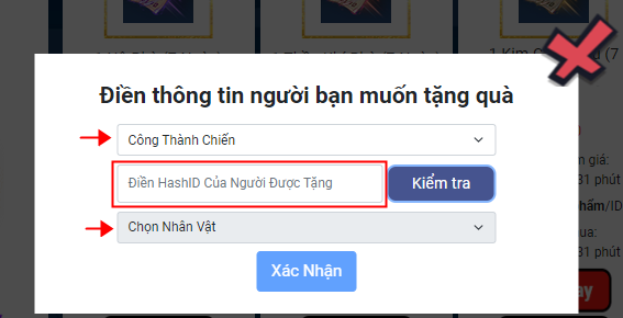 - Sau khi ấn "Tặng Quà" hiệp khách cần cung cấp thêm thông tin gồm: HASHID, TÊN NHÂN VẬT của người nhận. Riêng "Máy Chủ" hệ thống sẽ nhận cùng máy chủ tài khoản đăng đăng nhập mua hàng. Không thể tặng quà khác máy chủ.