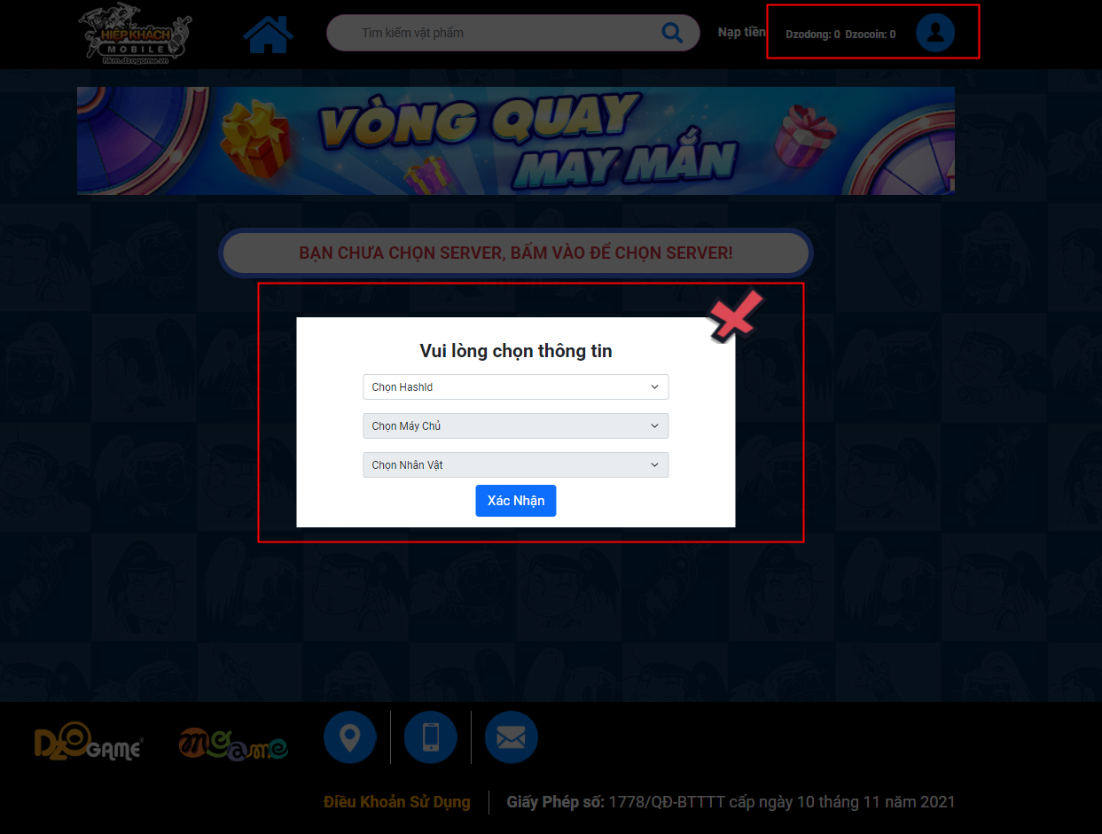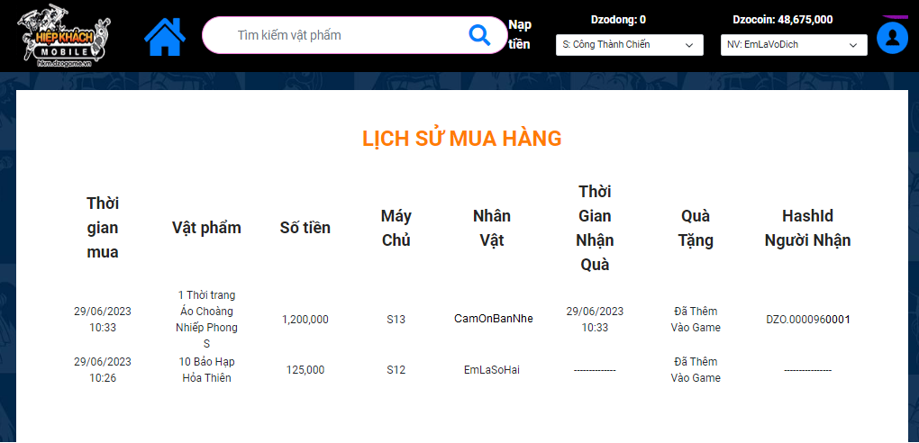 Sau khi đăng nhập thành công, hiệp khách cần chọn Nhân vật, HashID và Máy Chủ muốn mua hàng. Các thông tin giúp hệ thống trả chính xác vật phẩm về nhân vật trong game.
