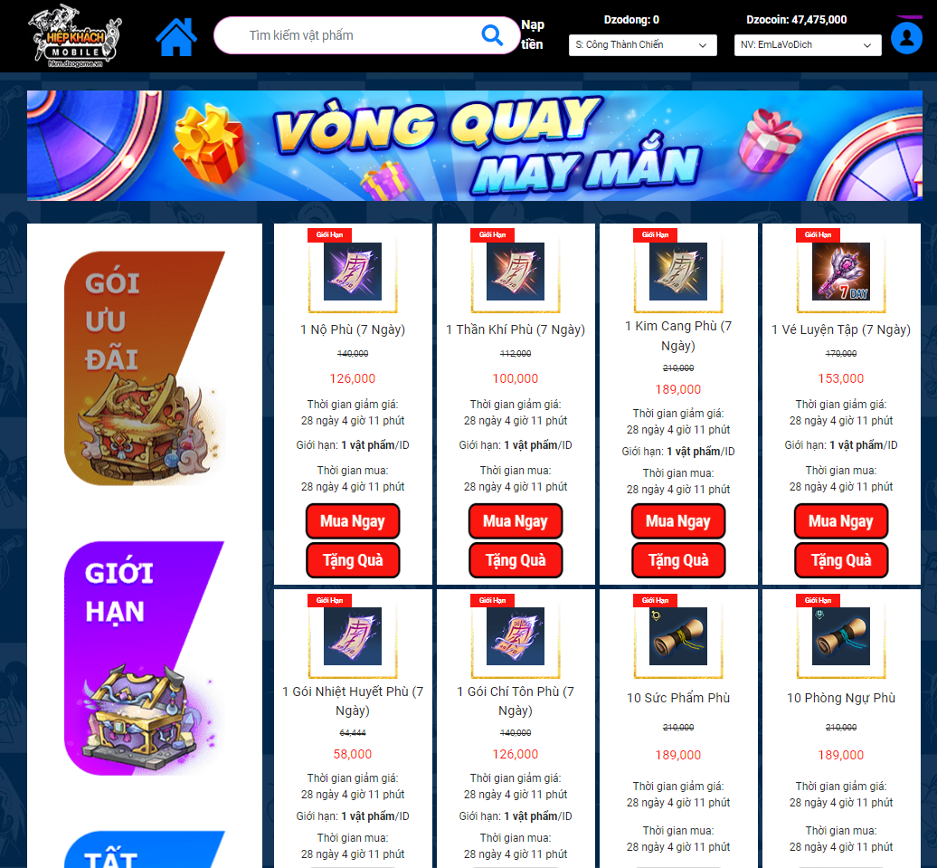 - Chú ý: khi tiến hành mua, tặng hoặc nhập quà sẽ trả về "HỘP THƯ" trong game.