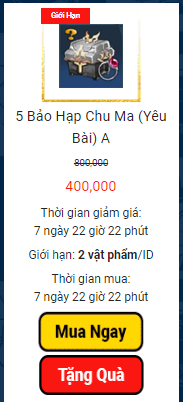 Ấn chọn 'MUA NGAY" với các vật phẩm có trong danh sách mở bán cho máy chủ và sự kiện. Sau đó bảng thông báo nhắc lại sẽ hiển thị, nếu tiếp tục mua hàng chọn "ĐỒNG Ý" ngược lại có thể tắt để hủy giao dịch.