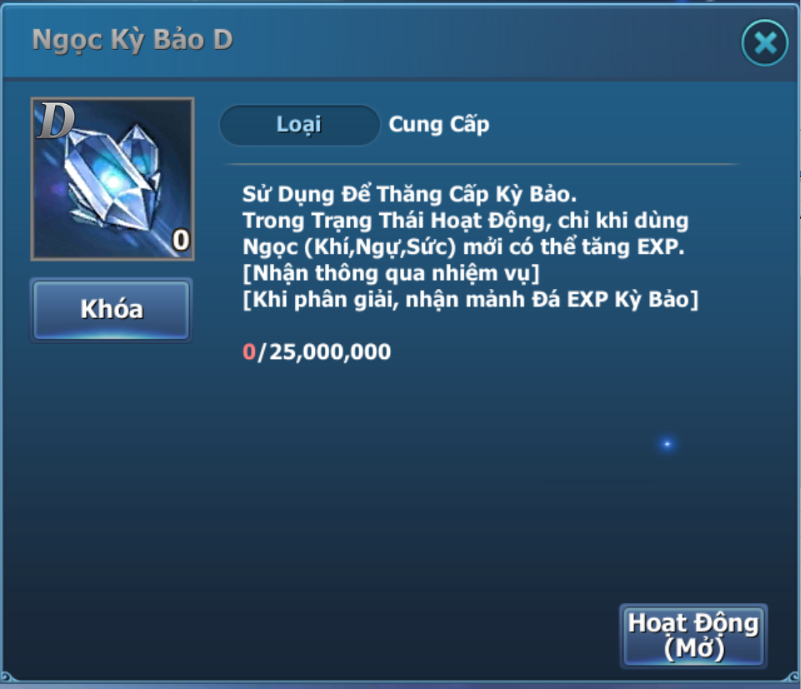 + Ngọc Kỳ Bảo D có thể nhận thông qua nhiệm vụ Kỳ Bảo hằng ngày. (Điểm cần thiết để Ngọc Kỳ Bảo D hoàn thiện: 25,000,000)