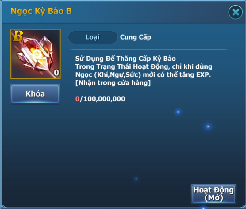 + Ngọc Kỳ Bảo B Hiệp Khách có thể nhận trong các sự kiện fanpage. (Điểm cần thiết để Ngọc Kỳ Bảo B hoàn thiện: 100,000,000)
